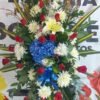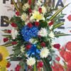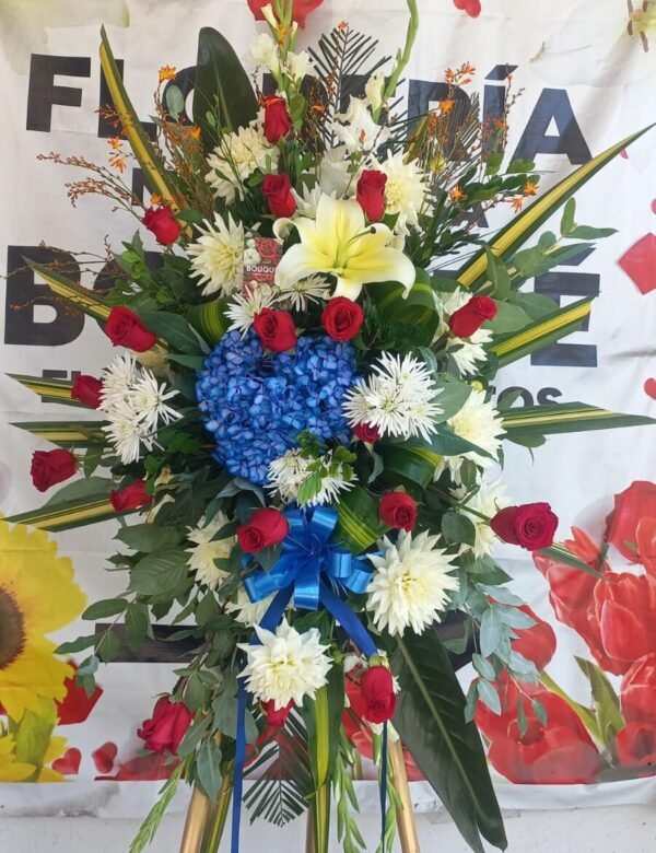 Un arreglo elegante con tulipanes blancos, hortensias azules, rosas rojas, claveles y follaje verde intenso. Un tributo lleno de belleza y significado para celebrar momentos especiales. 💐💙