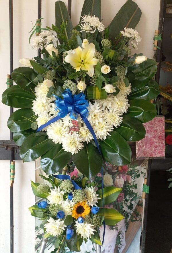 Esta corona funeraria es como un abrazo celestial, un susurro de amor y un recordatorio de los momentos compartidos. Las flores blancas, símbolo de pureza, paz y esperanza, se combinan perfectamente con los liliums amarillos, que representan la luz, la renovación y el renacimiento. El follaje verde intenso da vida y protección a todo el arreglo, mientras que los detalles azules añaden un toque de lealtad y afecto eterno.
