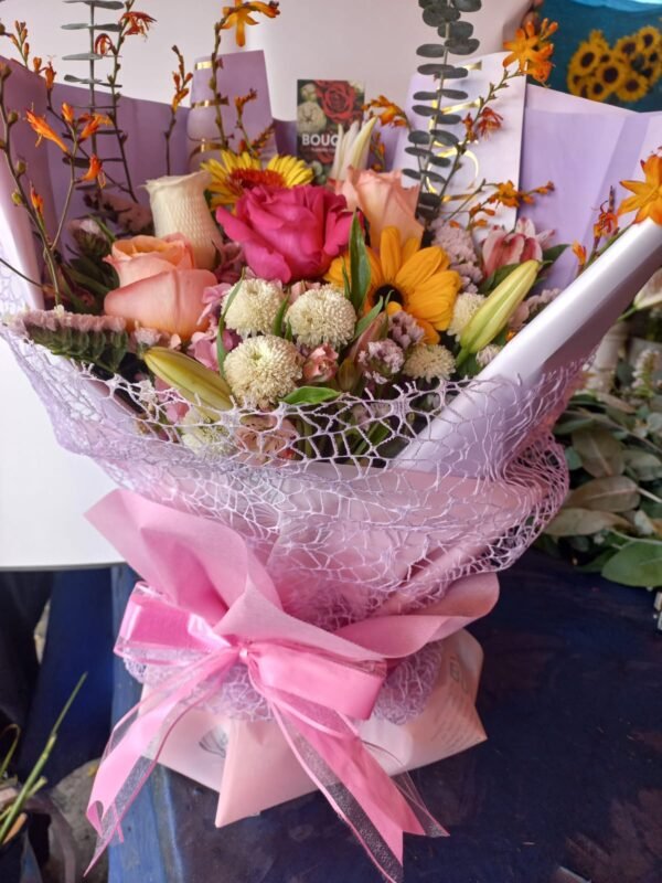 Este ramo es como un abrazo hecho de luz y colores: vibrante, alegre y lleno de vida. Las rosas rosadas transmiten ternura y amor; las gerberas blancas añaden pureza y frescura; los girasoles amarillos simbolizan la felicidad y la esperanza; y las alstroemerias le dan un toque elegante y duradero. Todo esto envuelto en un lazo rosa que da ese toque femenino y acogedor.