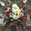 Un trípode elegante con rosas rojas, liliums blancos, hortensias, alstroemerias y follaje verde intenso. Un tributo lleno de amor y respeto para quien dejó huella. 💐🕊️