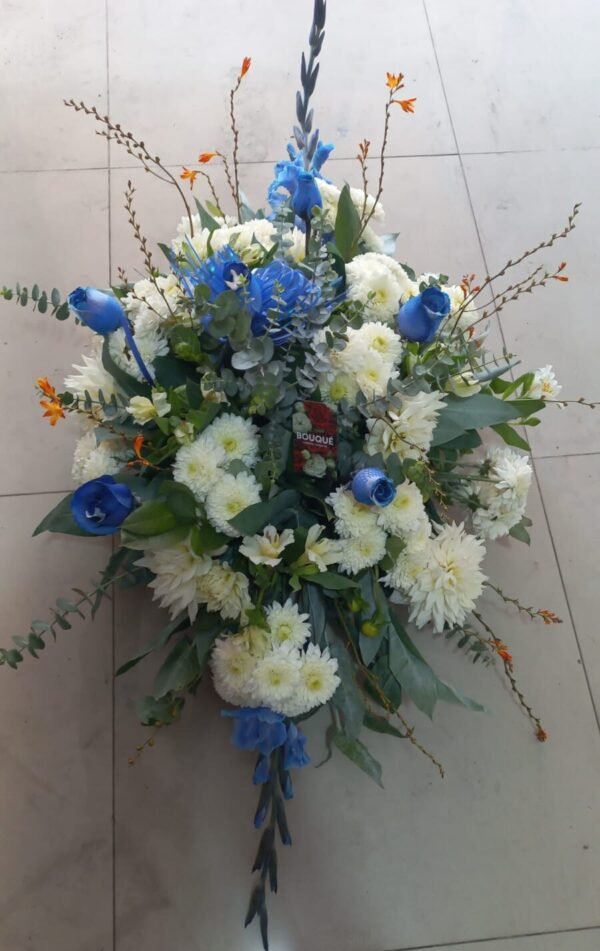 Este manto funerario es como un abrazo celestial, un susurro de amor y un recordatorio de los momentos compartidos. Las flores blancas, símbolo de pureza, paz y esperanza, se combinan perfectamente con las rosas azules, que representan la lealtad, el afecto eterno y la introspección. El follaje verde intenso da vida y protección a todo el arreglo, mientras que pequeños detalles como las flores naranjas añaden un toque de calidez y energía.