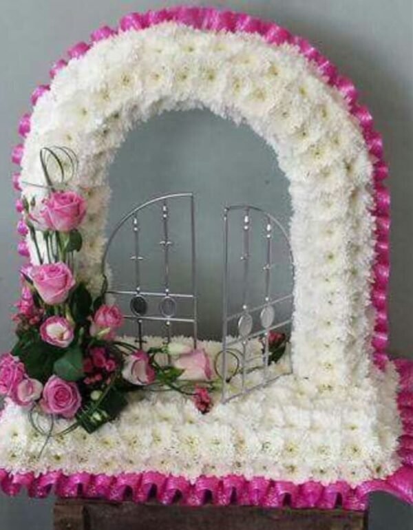Este arreglo es como un abrazo celestial, un susurro de amor y un recordatorio de los momentos compartidos. Los claveles blancos, símbolo de pureza y esperanza, forman un arco perfecto que rodea una puerta metálica, simbolizando el paso a un lugar mejor. Las rosas rosadas añaden ternura y cariño, mientras que los detalles metálicos le dan un toque elegante y duradero.