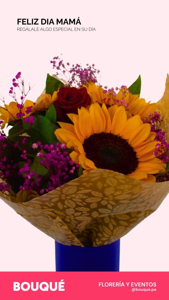 Este ramo es como un abrazo hecho de sol: lleno de luz, alegría y esperanza. Los girasoles amarillos, símbolo de felicidad y optimismo, son el centro de atención, irradiando positividad por todos lados. Los claveles rojos añaden un toque de pasión y devoción, mientras que las flores delicadas y el follaje verde intenso dan vida y equilibrio al diseño.